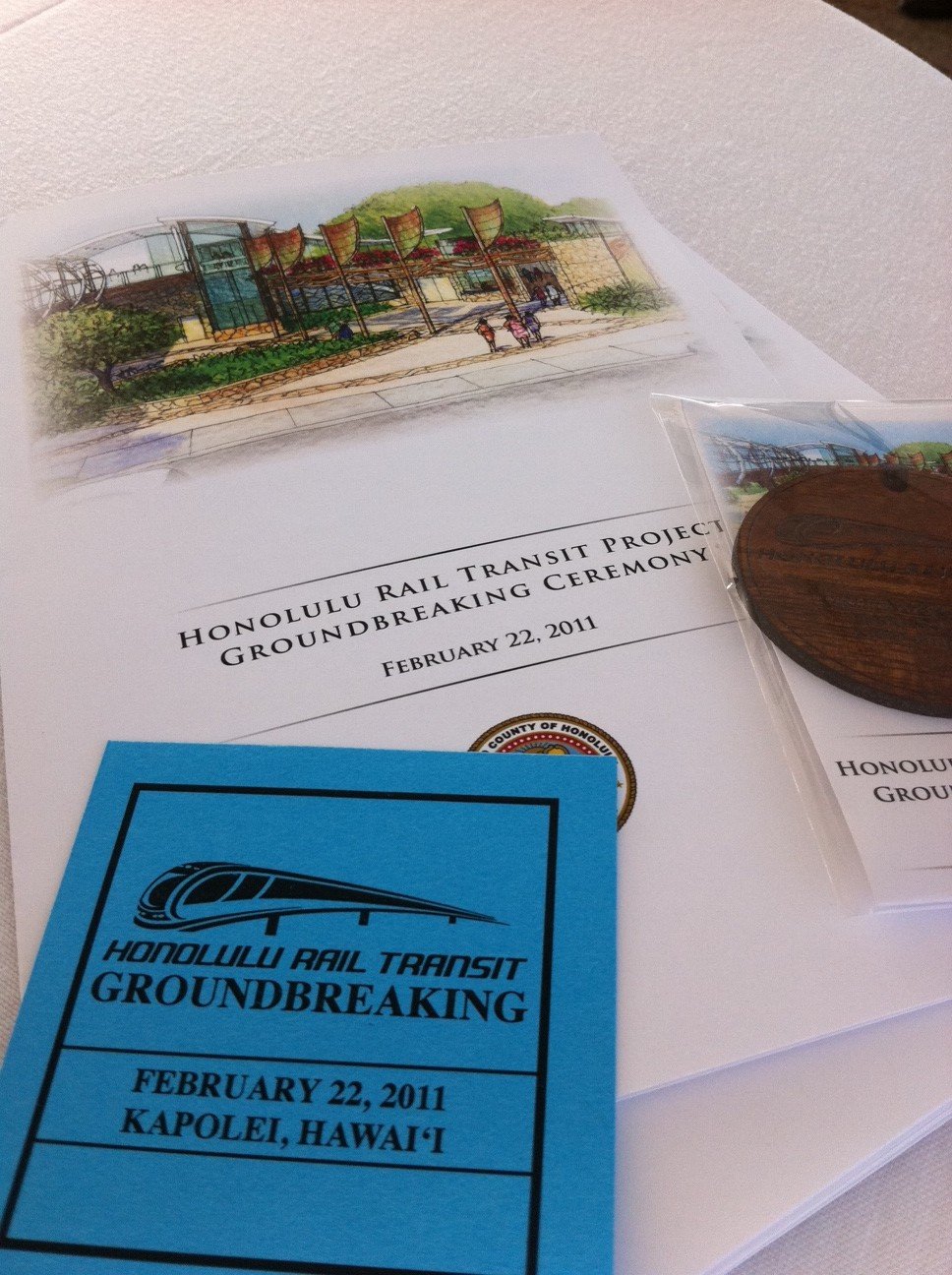 I had the pleasure of being present at a historical moment the other day – February 22nd, 2011 to be exact. This marked the official groundbreaking of the Rail Transit System right here on Oahu, Hawaii. Now, before I go further into my day, let me just address the elephant in the room at this time. I KNOW there are critics. I KNOW there are proponents. I KNOW there are environmental and aesthetic concerns. I KNOW there are traffic concerns. I KNOW there are pros just as much as I know there are cons. The argument for whether or not we NEED rail in its current proposed state is NOT the point of my writing. So…put down the knives people…I’m just here to talk about my own PERSONAL opinion and the day as it unfolded.