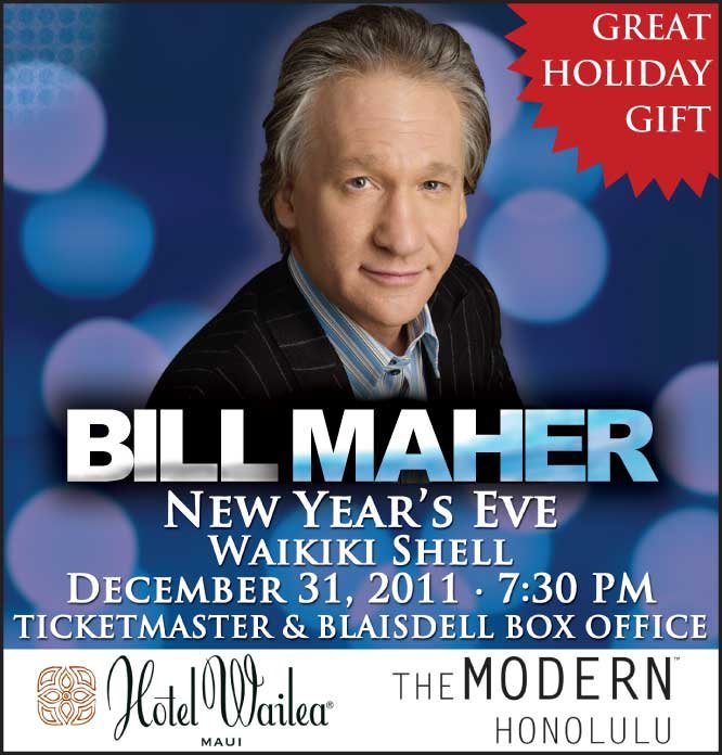 Comedian Bill Maher is making the rounds in Hawaii and will be on Oahu and Maui in late 2011. He will make his Hawaii debut with two shows, one on New Year’s Eve at the Waikiki Shell and another January 1 at the Maui Arts & Cultural Center.