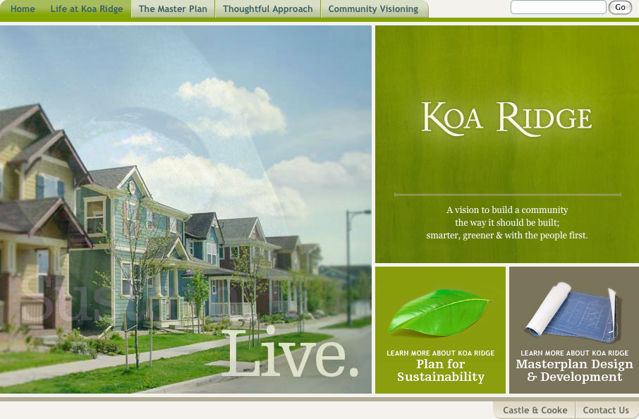 The original Koa Ridge planned for 5,000 homes, a hotel, medical campus, retail stores, parks and two schools. That same plan remains in affect, if Castle and Cooke are ever able to get approval. Before the court setback, Castle & Cooke was seeking City Council zoning approval and hoped to start construction next year to deliver initial homes by the end of 2013. That finish date seems highly unlikely now, however Castle and Cook have not released new development timelines.