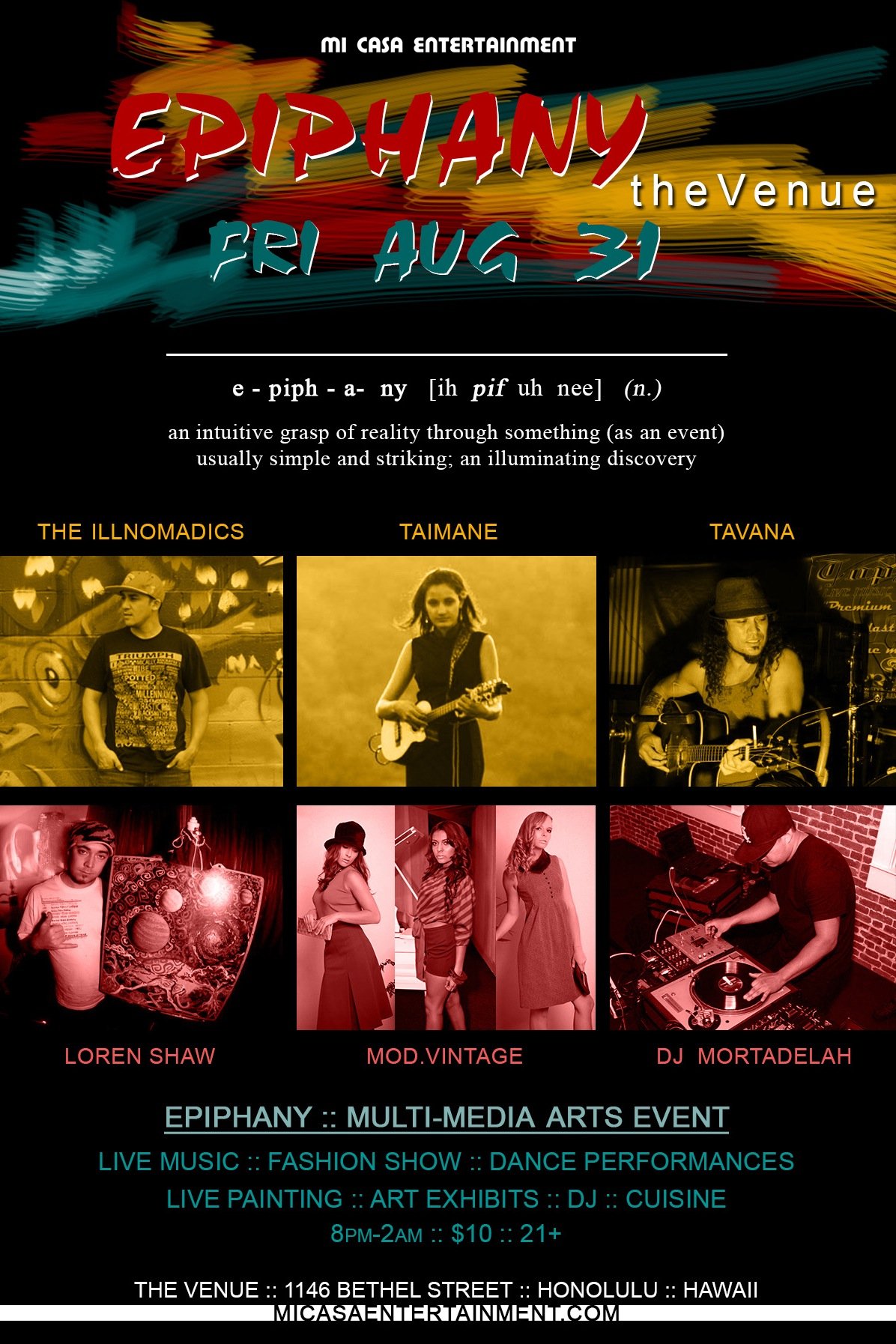 The art of multi-media is something that is growing increasingly popular, especially in the media driven society that we all live in today. With that being said, Mi Casa Entertainment www.MiCasaEntertainment.com has put together a huge multi-media arts event titled “Epiphany: Multi-Media Arts Event.” This huge event will be held at “The Venue” on Bethel Street and will combine music, fashion, dance, art, video and cuisine. Basically, there will be something for everyone.