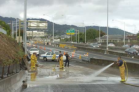 The H-1 Freeway is closed in the Ewa-bound direction at the School Street off-ramp because of a mudslide on the freeway. Motorists are being directed to exit at School Street and re-enter the freeway at Vineyard Street.