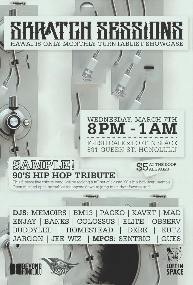 Join us at Skratch Sessions: Hawaii’s only monthly turntablist showcase! This month, we pay tribute to the “Golden Era” of hip-hop and rock nothing but that good ol’ ’90’s hip-hop! Special Guest feature: The live band ‘SAMPLE’ hits the stage to play live versions of ’90’s classics, as our DJ’s provide the scratches — open mic for anyone down to rock their favorite track!